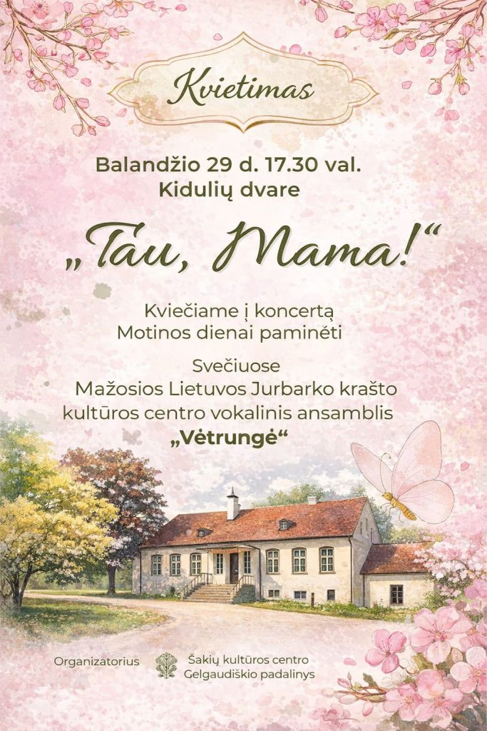 Koncertas Motinos dienai paminėti kiduliai.lt · Publikuota 2026-04-09 · Atnaujinta 2026-04-10 Facebook0Tweet0Pin0Print0Email0 Kviečiame balandžio 29 d. 17.30 val. į koncertą Motinos dienai paminėti „Tau, Mama!”, kuris vyks Kidulių dvare. Svečiuosis Mažosios Lietuvos Jurbarko krašto kultūros centro vokalinis ansamblis „Vėtrungė”.